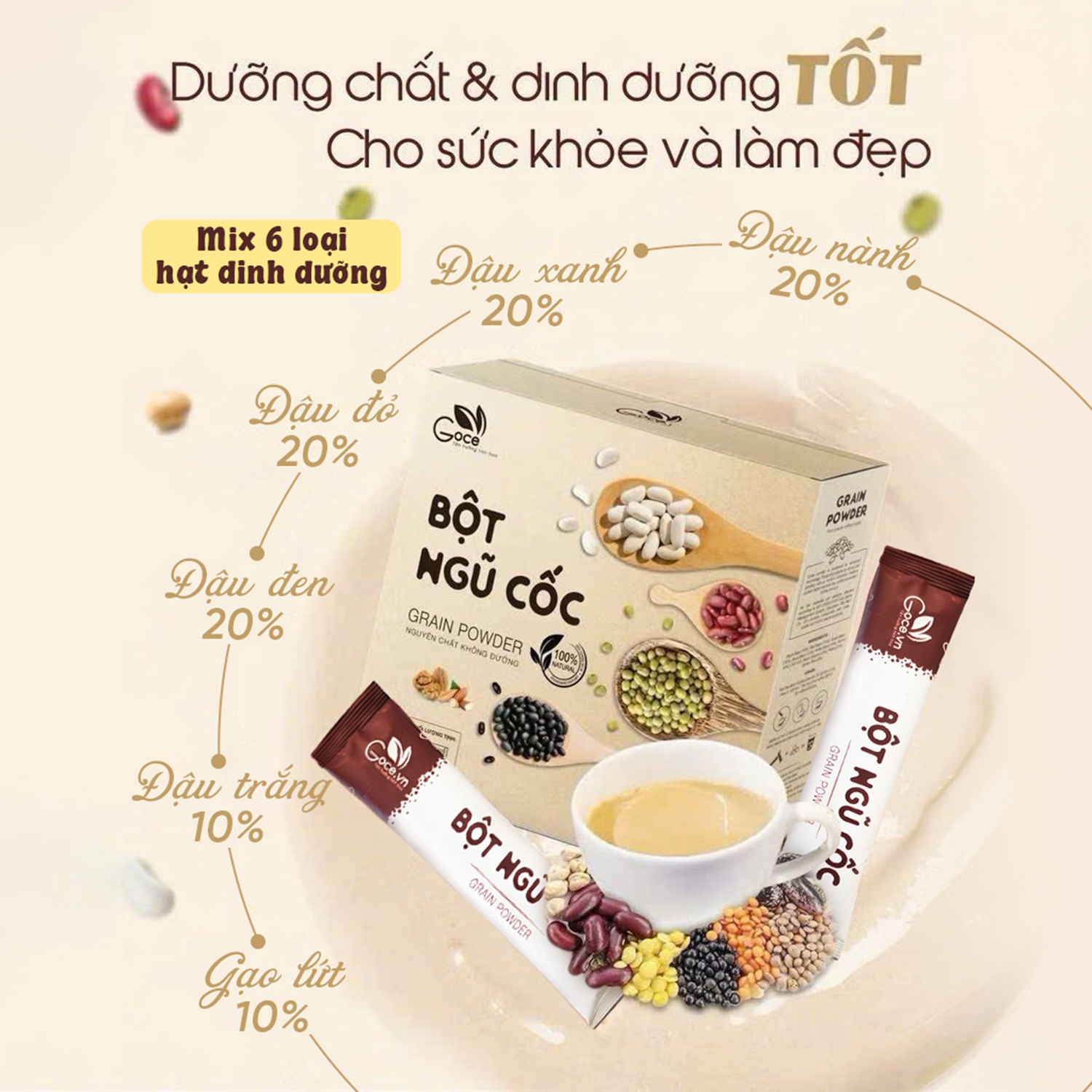 - Đậu xanh 20%, Đậu nành 20%, Đậu đen 20%, Đậu đỏ 20%, Đậu trắng 10%, Gạo lứt 10%