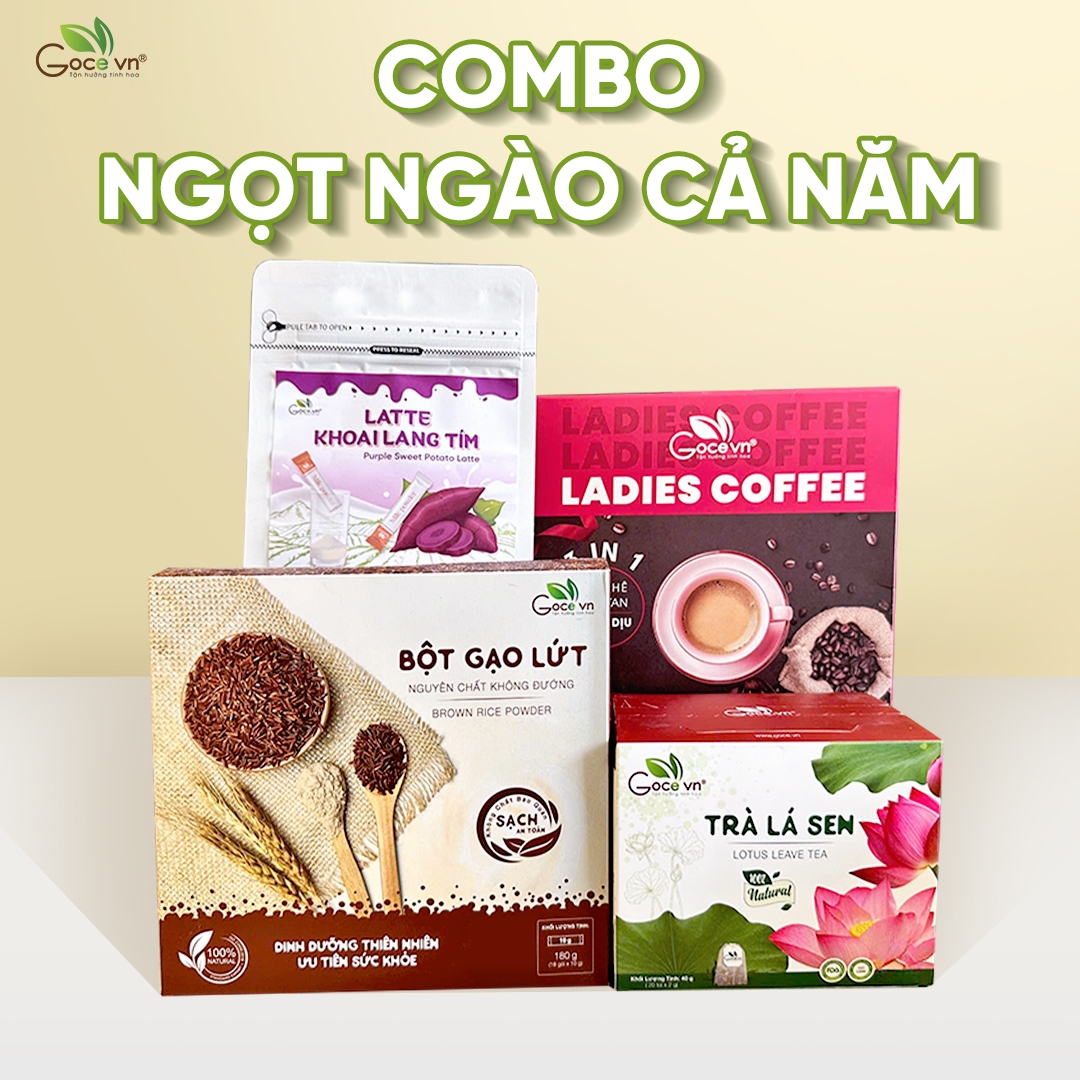 - Trà Lá Sen túi lọc Goce + Bột Gạo Lứt Goce + Latte Khoai Lang Tím Goce + Cà phê hòa tan Ladies Coffee 3in1