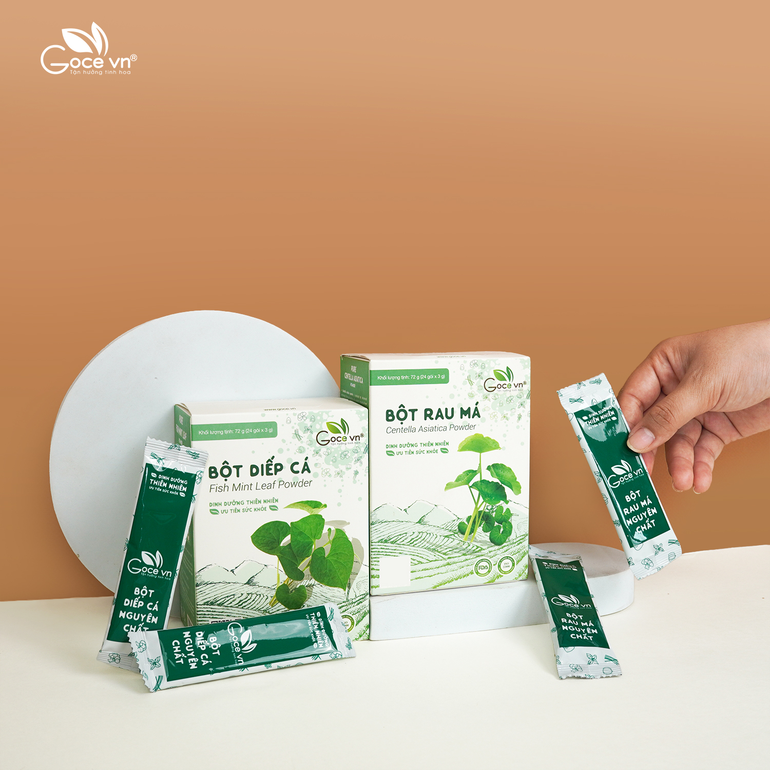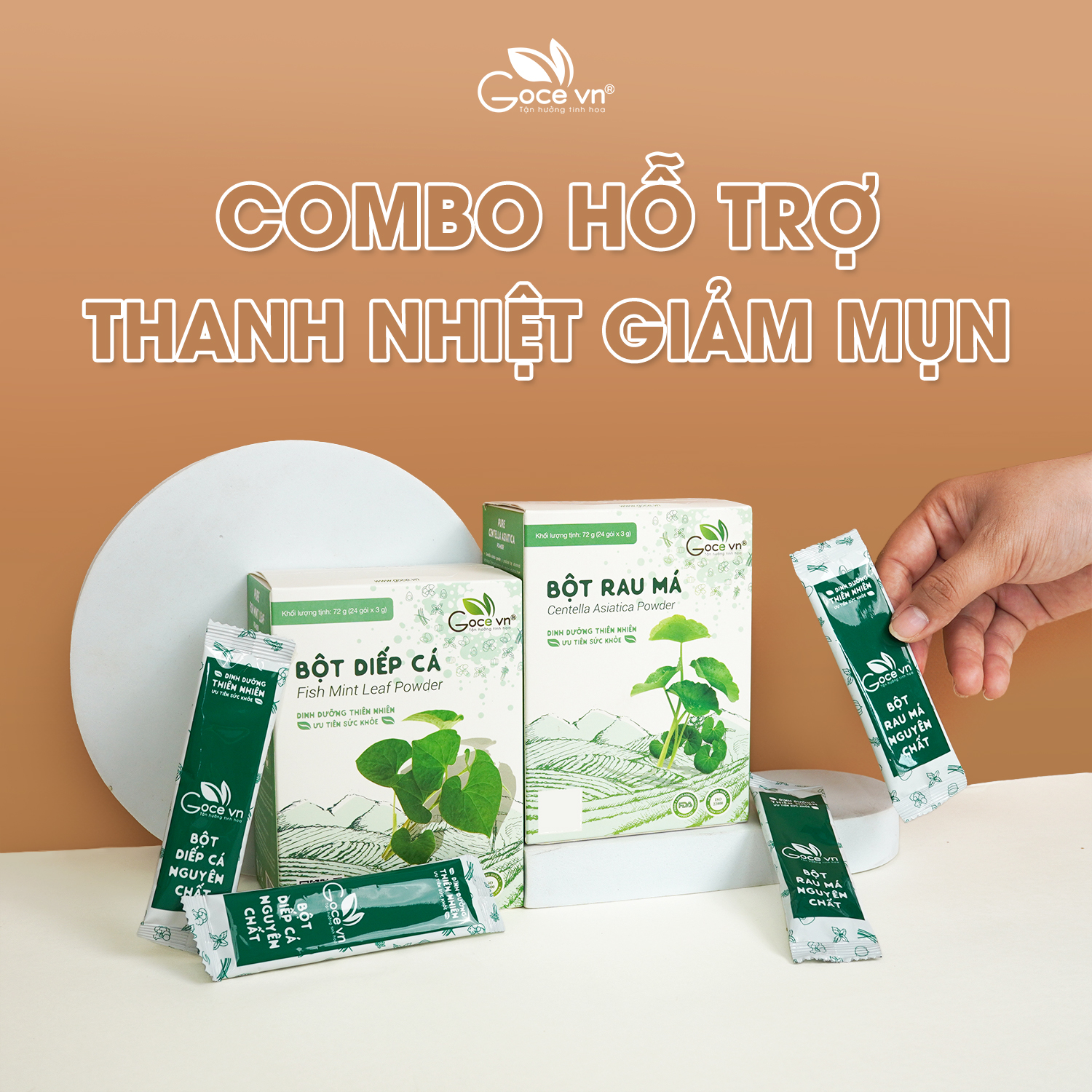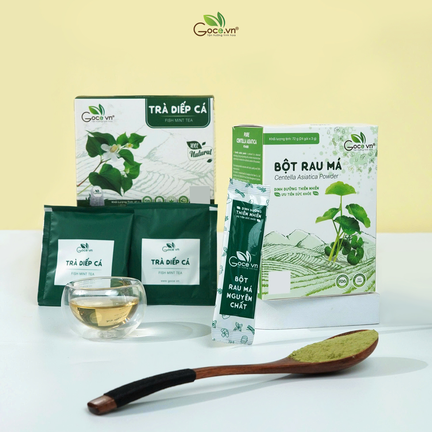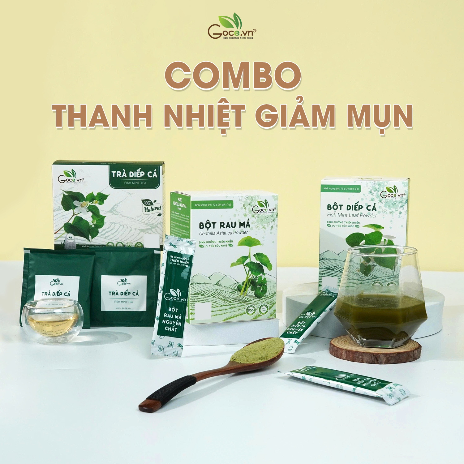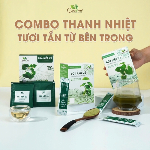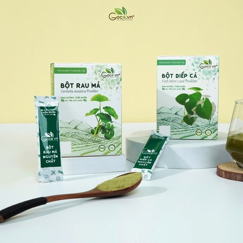 - Bột Diếp Cá: 100% nguyên chất từ rau diếp cá tươi. Bột Rau Má: 100% nguyên chất từ rau má tươi